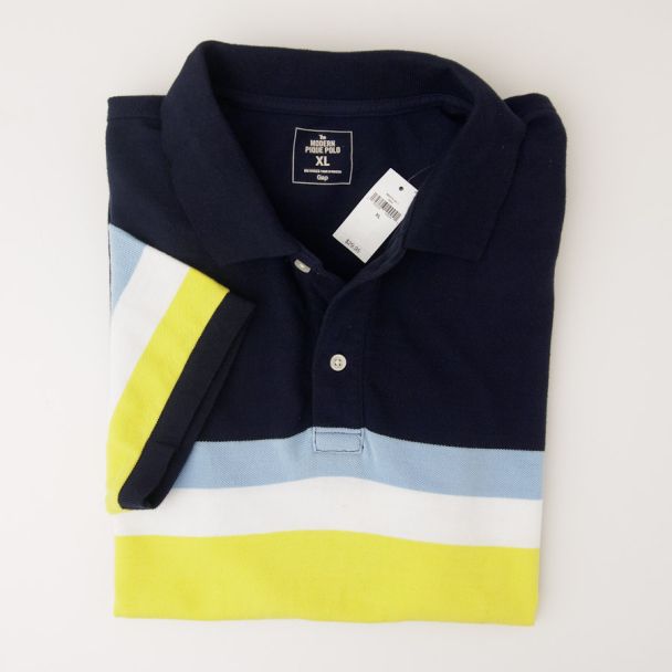 NEW Gap Modern Pique Chest Stripe Polo Shirt in Navy Yellow Stripe